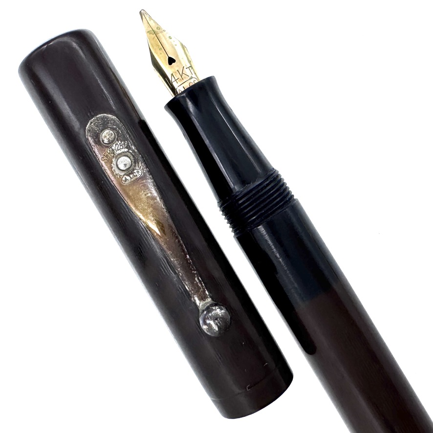 This lever-filler pen shows careful and consistent wear typical of a pen that has seen a century of use. The hard rubber and metal patinas are quite lovely.