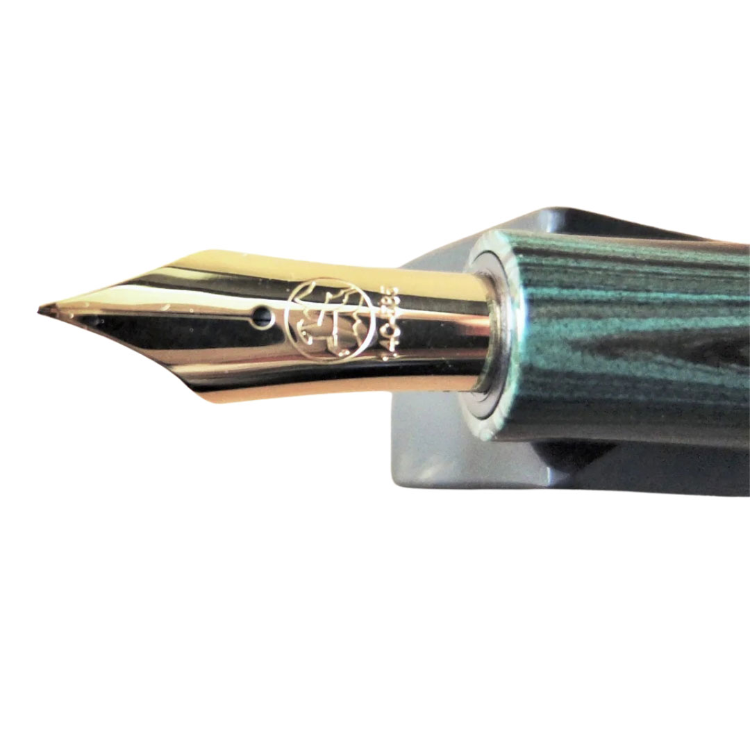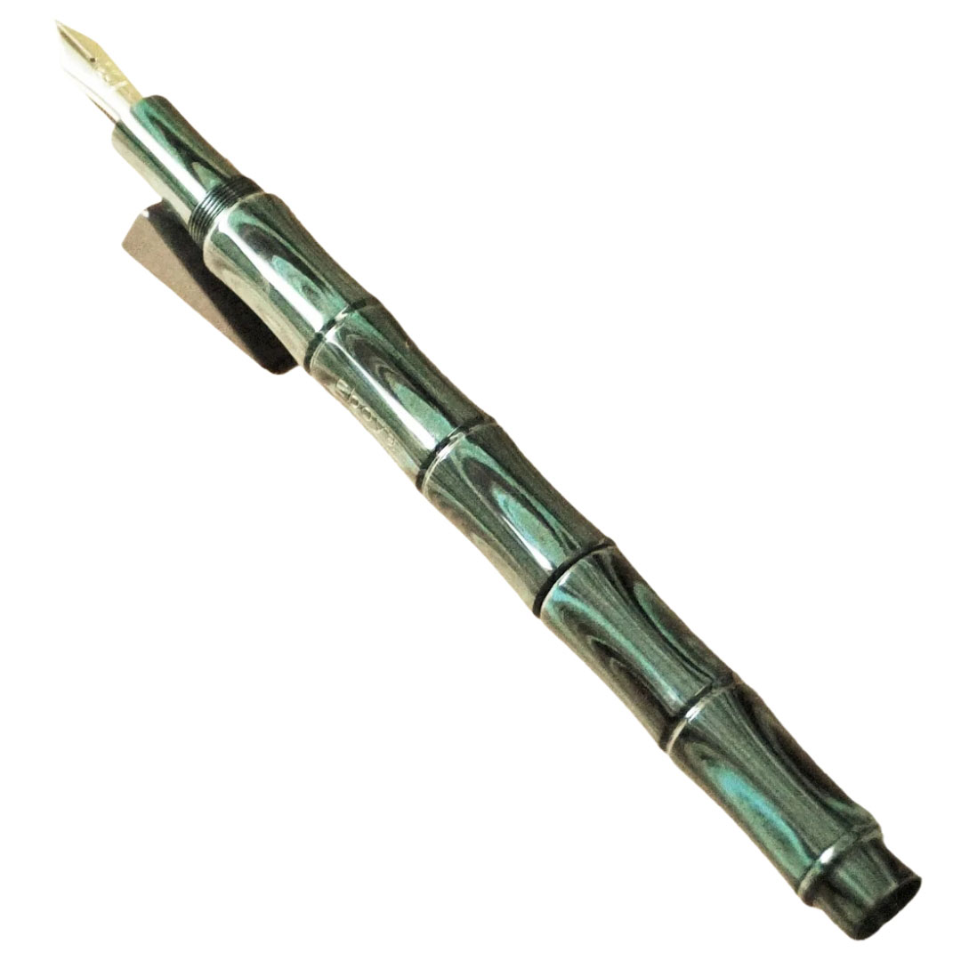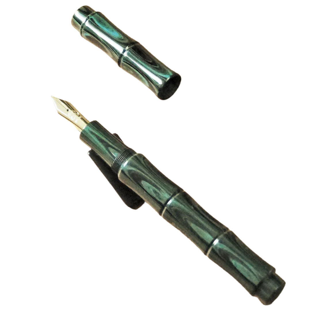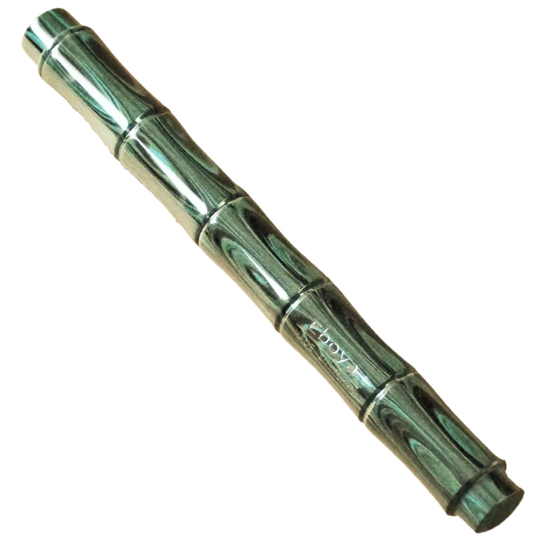The Eboya Ricchiku Medium Kaze Blue Green is one of the most noted and recognizable models produced by Tokyo-based Eboya. At 5.6 long, this is a full-sized fountain pen that will be a comfortable fit for most users – the ridges, designed to emulate the undulating shape of bamboo, provide comfortable gripping points along the barrel.