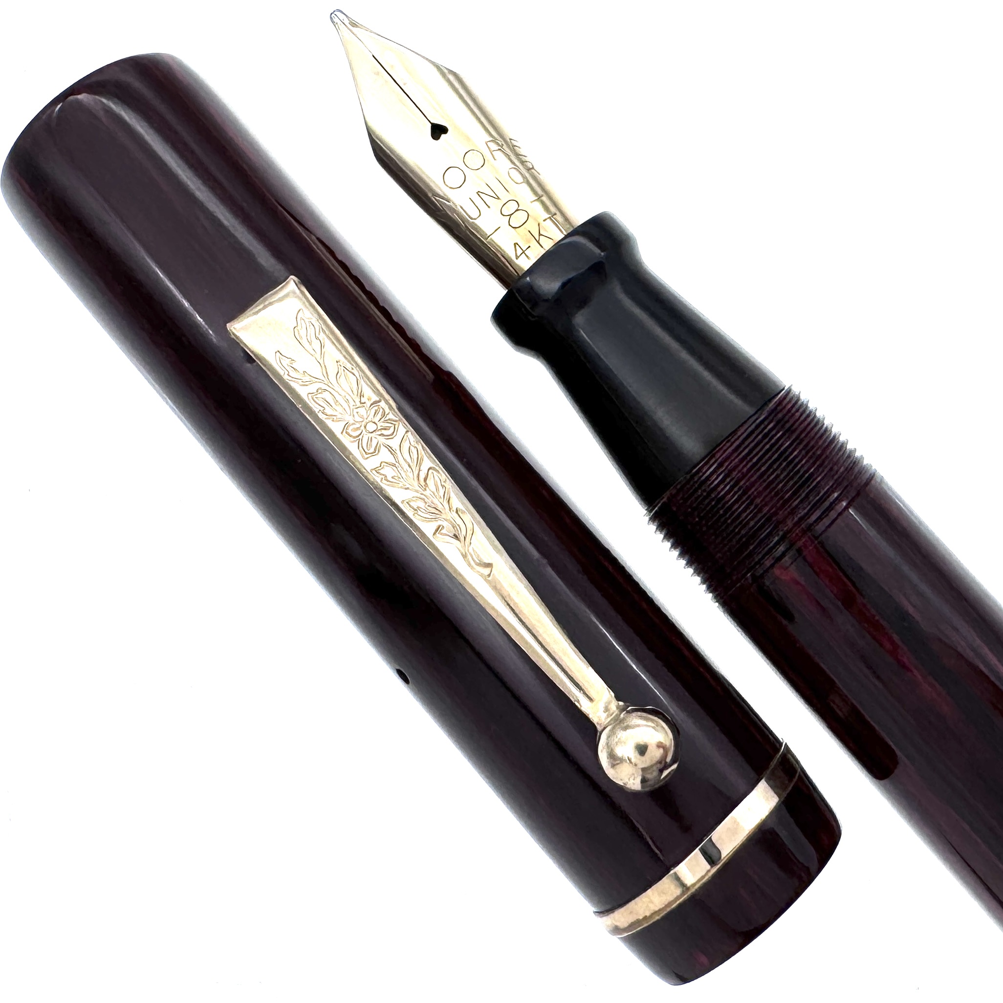 The Moore Junior #8 nib was re-tipped here to a smooth medium broad point, and can be further modified to your preference of writing styles. It replaced an inferior nib with this 14K nib in beautiful condition. This pen is from the personal collection of PacificPenWorks nib specialist John Mottishaw.
