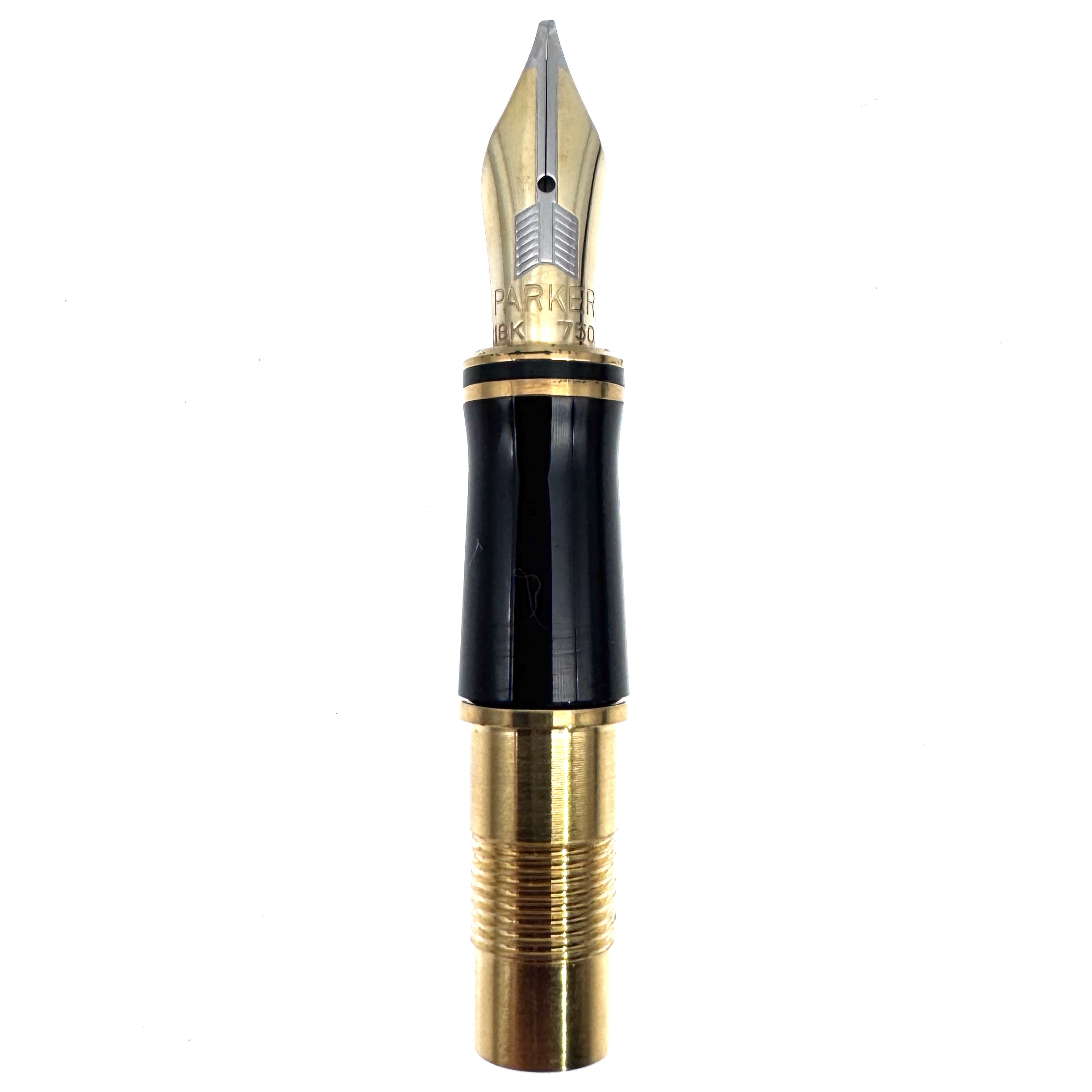 These Parker Duofold International Broad Left Oblique nib units are in very good condition, showing minor plating loss on the leading cap band. They are either marked “B” or “88” on the underside of the feed but both are left oblique cuts, favored by many people who prefer that angle and line width variation for cursive writing.