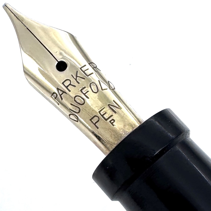 The immaculate Parker Duofold medium nib writes smoothly and consistently. Notice the knurling on the top of the cap end and the imprint. They are sharp and crisp, indicating little and careful wear over the 100+ years of this pen’s life. Hard rubber material has an excellent life span and is not as prone to problems of later pen materials, especially of the late 20’s and early 30’s. A fresh rubber bladder has been installed after internal cleaning and refurbishing. This pen is ready to write.
