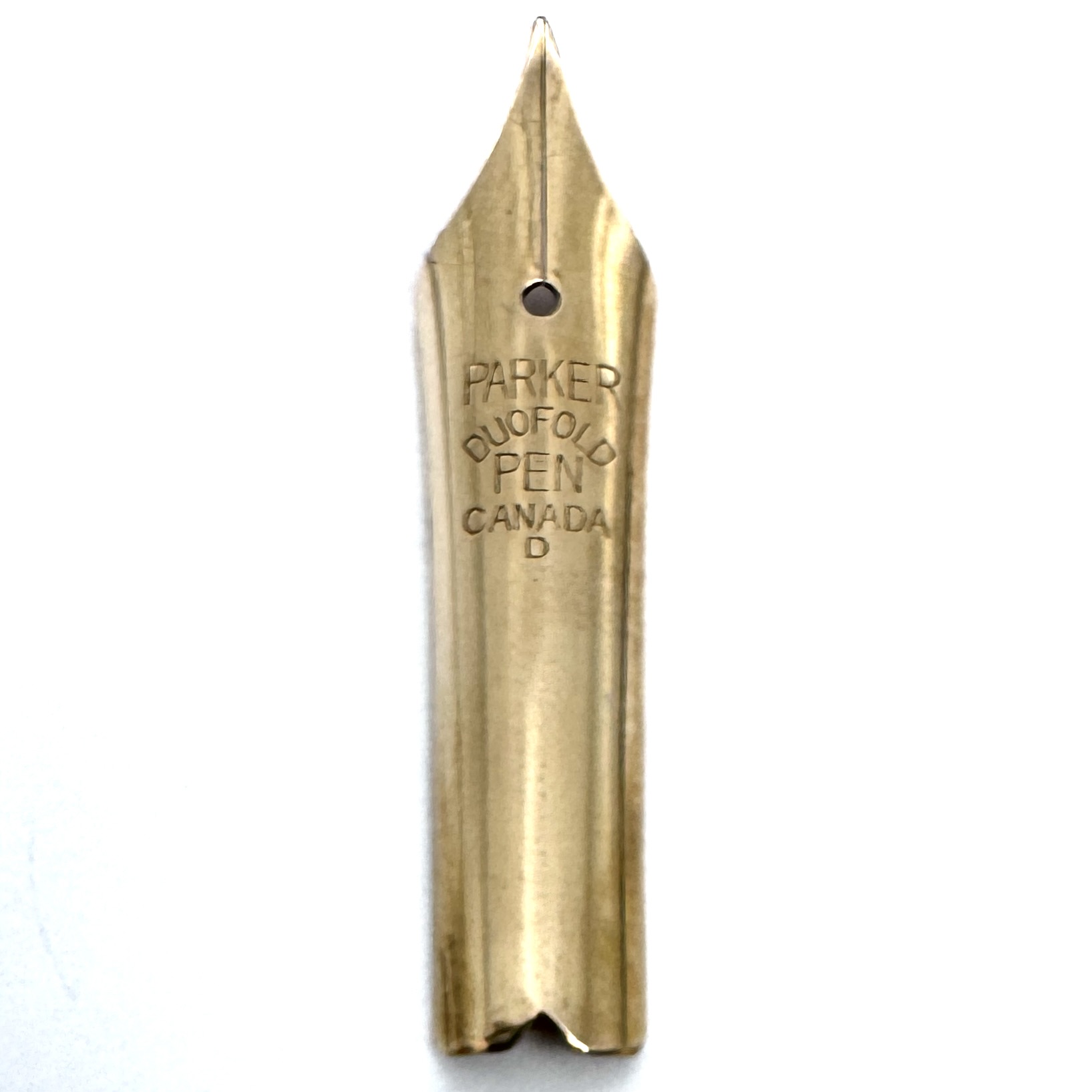 These Parker Duofold Senior nibs originated in the Canadian nib works and are imprinted PARKER DUOFOLD PEN CANADA and either the letter D or E as a code below the word Canada. They are in excellent condition and fit the Senior Duofold pens. They measure 33.9mm long and 8.1mm at the shoulders. They have extra fine original tips and are very well made.