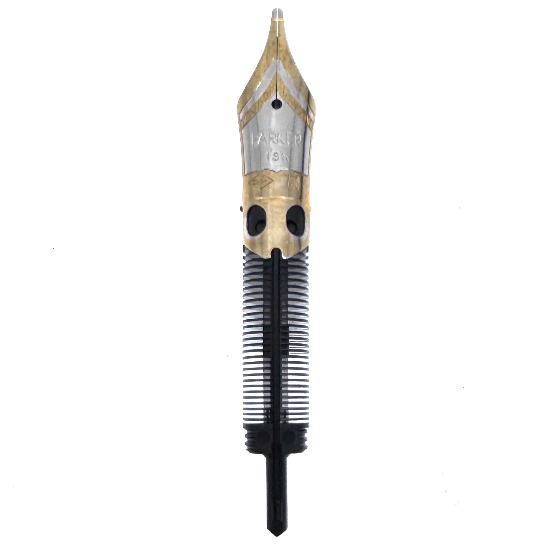 These Parker Sonnet Broad nib units are in Mint condition, having never been used. They are 18K solid gold with a two-tone rhodium mask. They are easy to instal in Sonnet sections as they simply screw in using the threads at the end. The feeds are designed to accommodate the specific amount of ink that the nibs demand. First introduced in 1994, the Parker Sonnet fountain pen has gone through various iterations and today is mostly found with steel nibs. These nibs are from the early solid gold models and still fit into all the later pens. They tend to be semi-flexible and show line width not only by the shape of the tip but also depending on the amount of pressure applied in writing. Some consider the Parker Sonnet one of the most underrated of fountain pens.