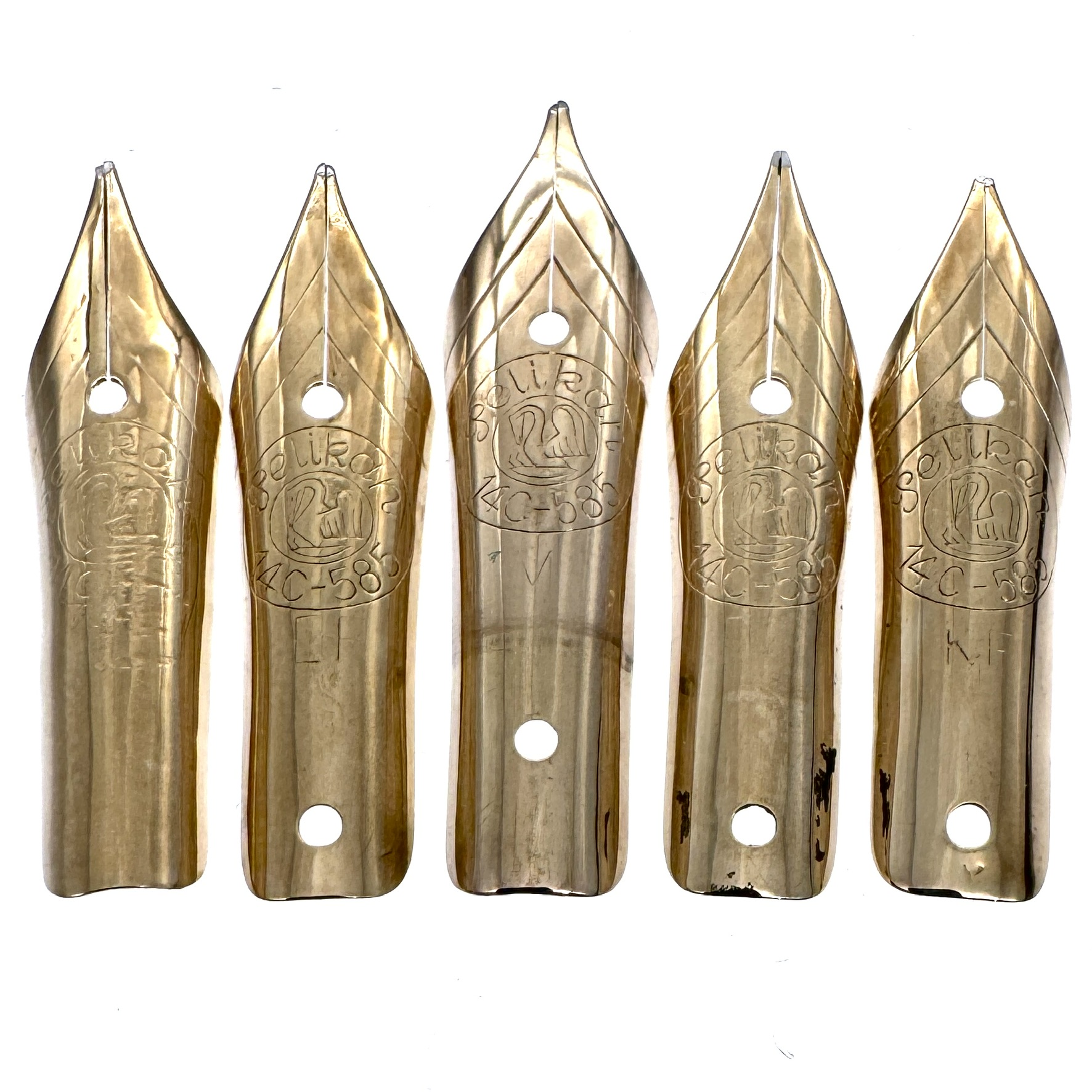 This group of five Pelikan vintage 14C gold nibs vary in tip size and shape and flexibility. All the tipping is in tact. They vary in length from 28mm for the longest to 25mm for the shortest.