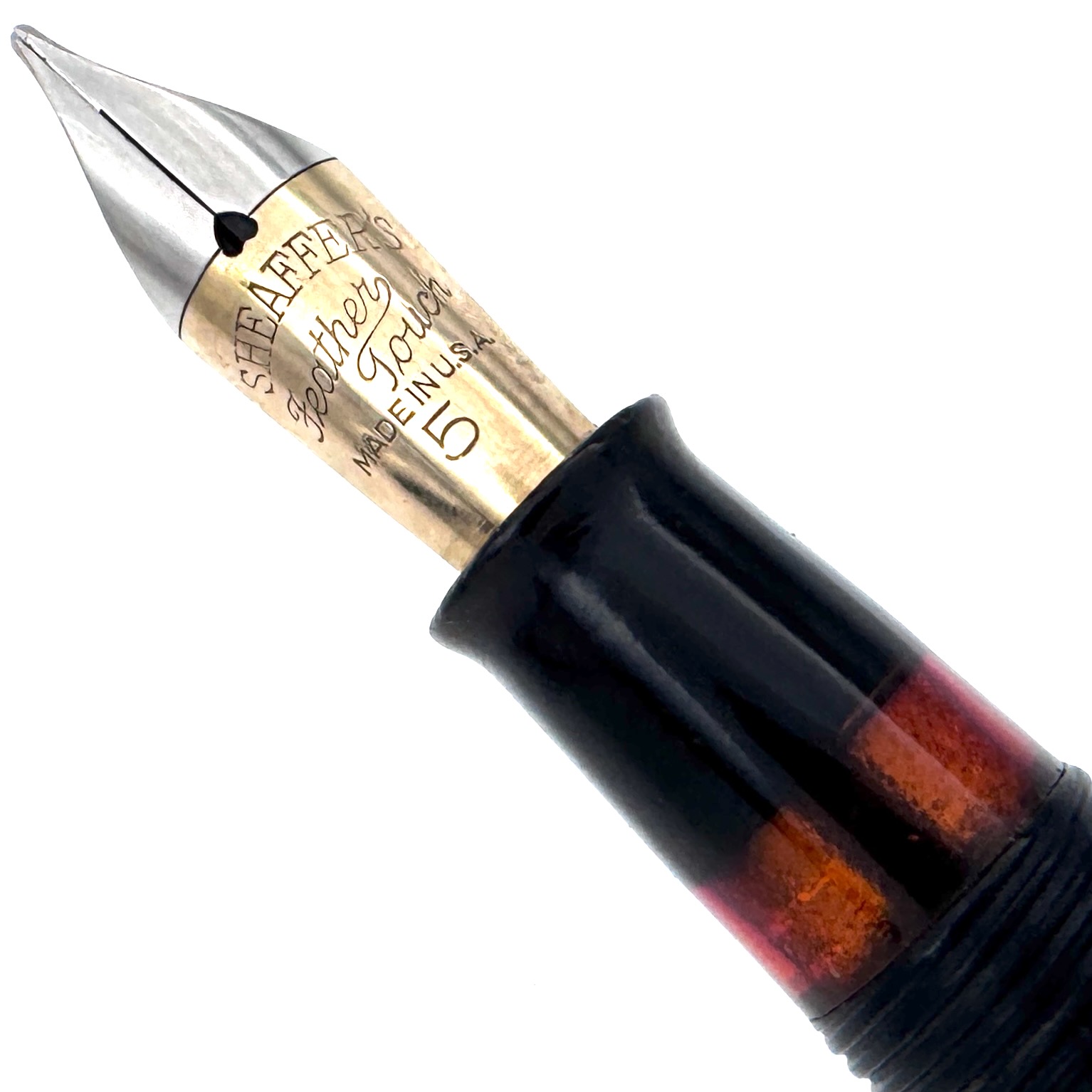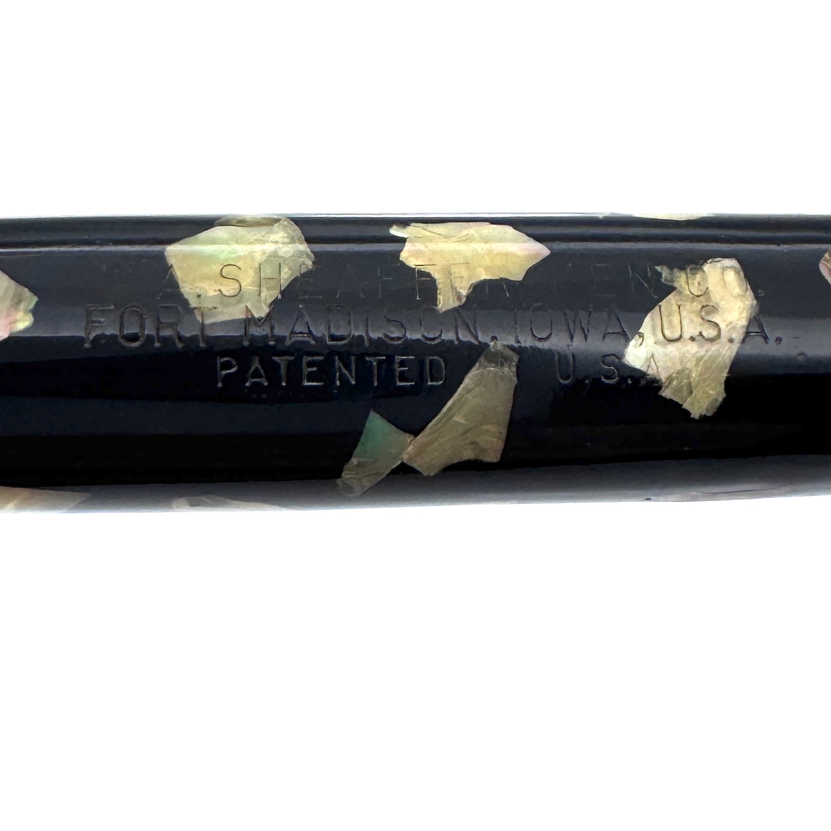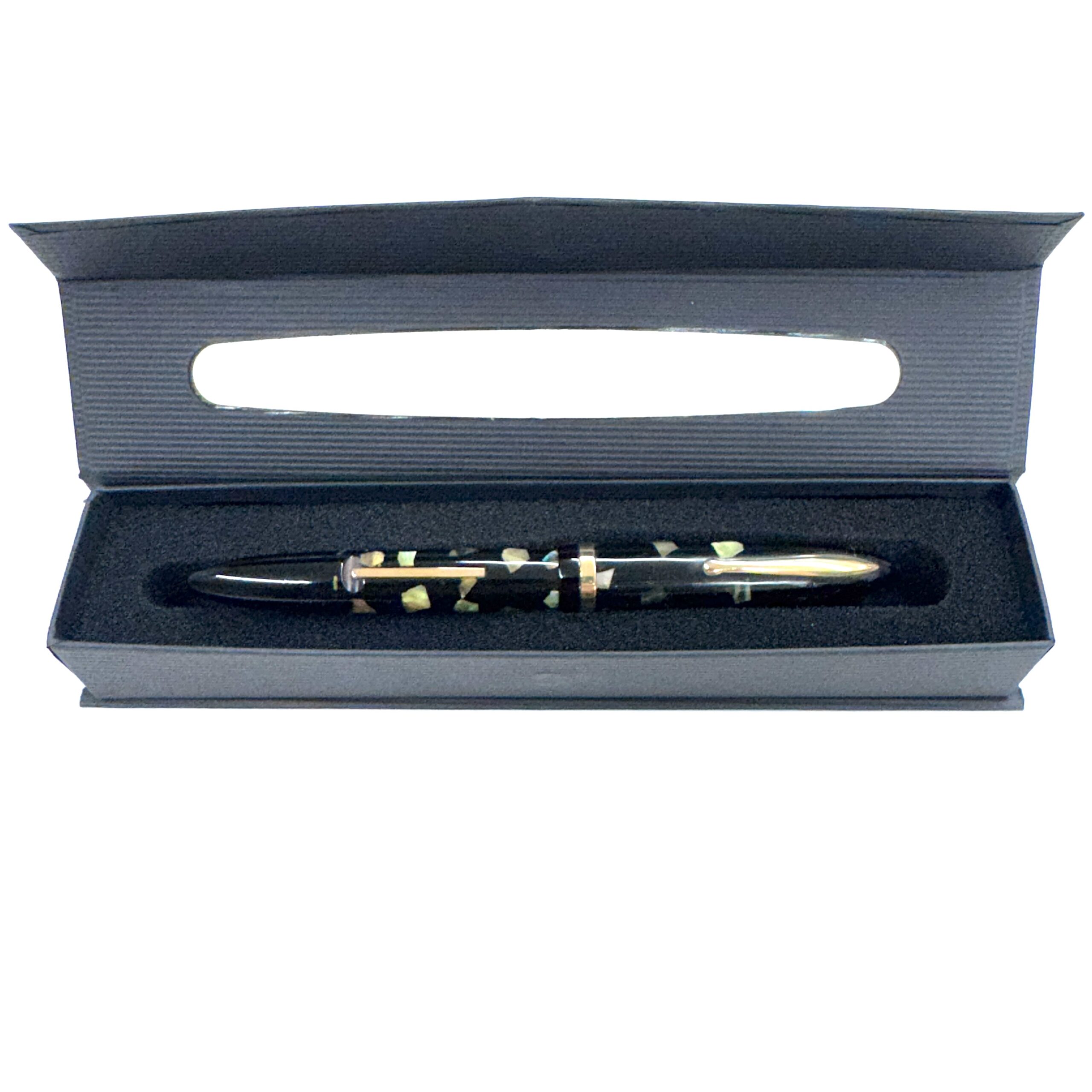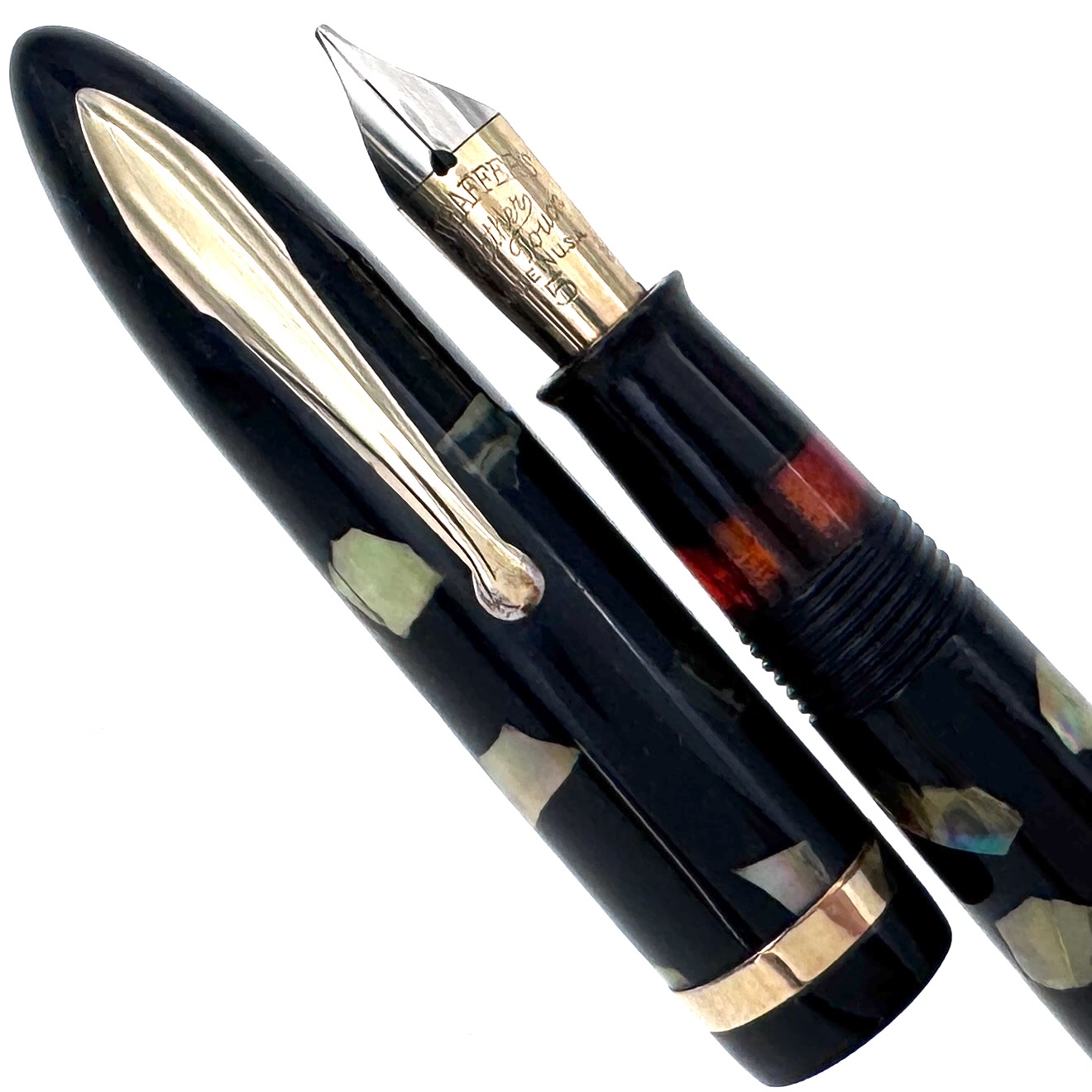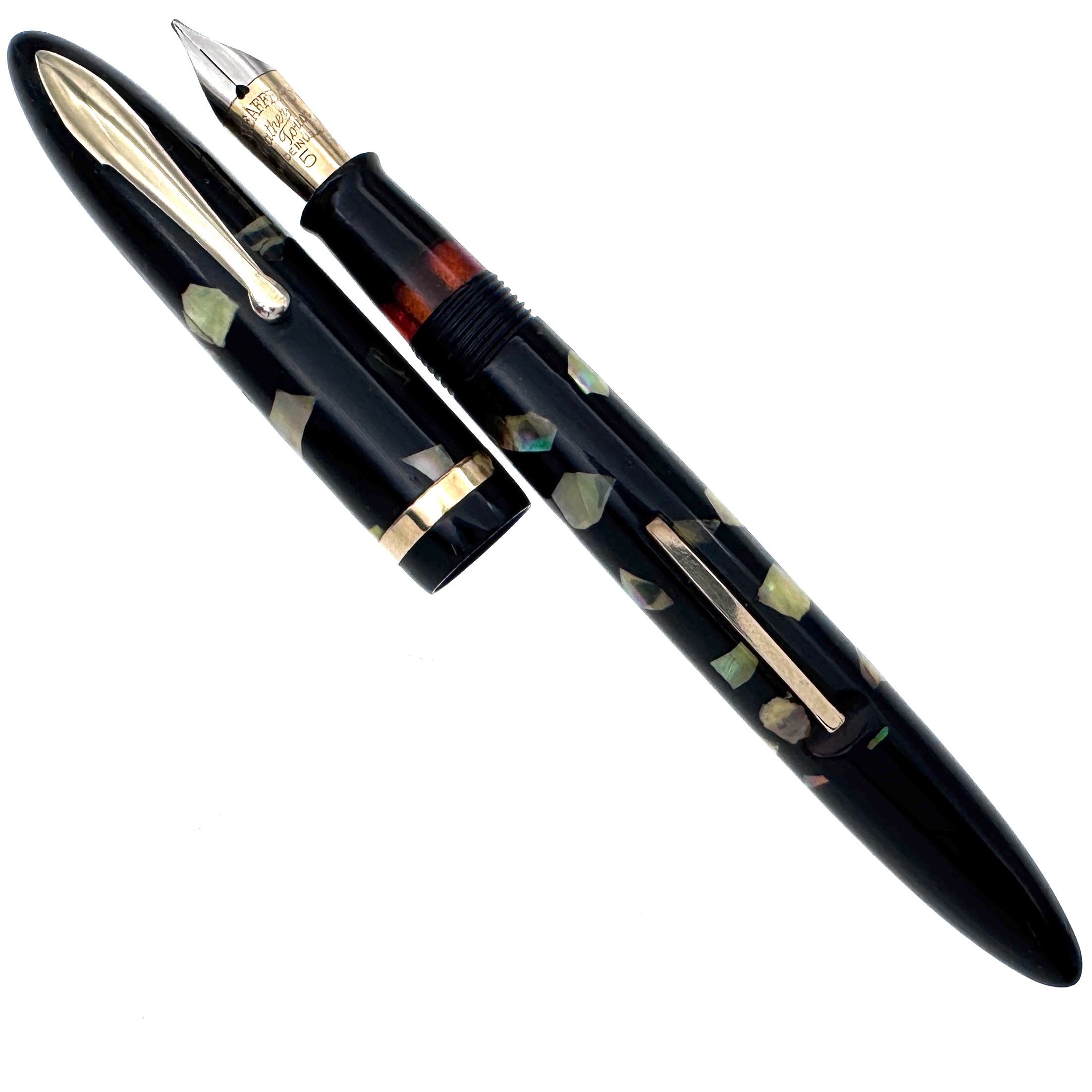 This Sheaffer’s Feathertouch 5 fountain pen was likely inspired by the abalone work coming out of Japan during this period. These pens were produced in the mid to late 1930’s and this one was later, as evidenced by the pocket clip without the stamped Sheaffer’s logo.