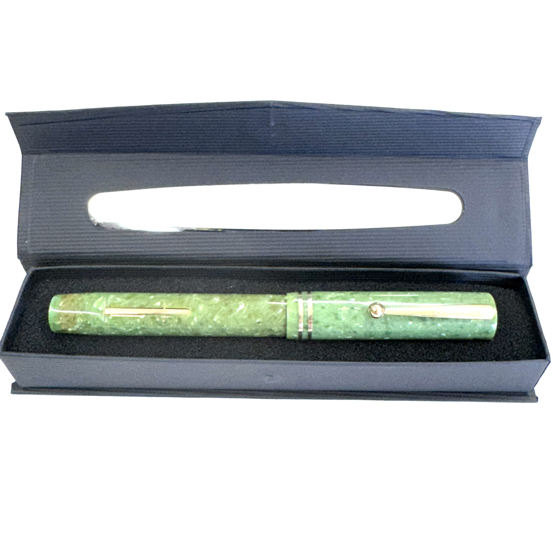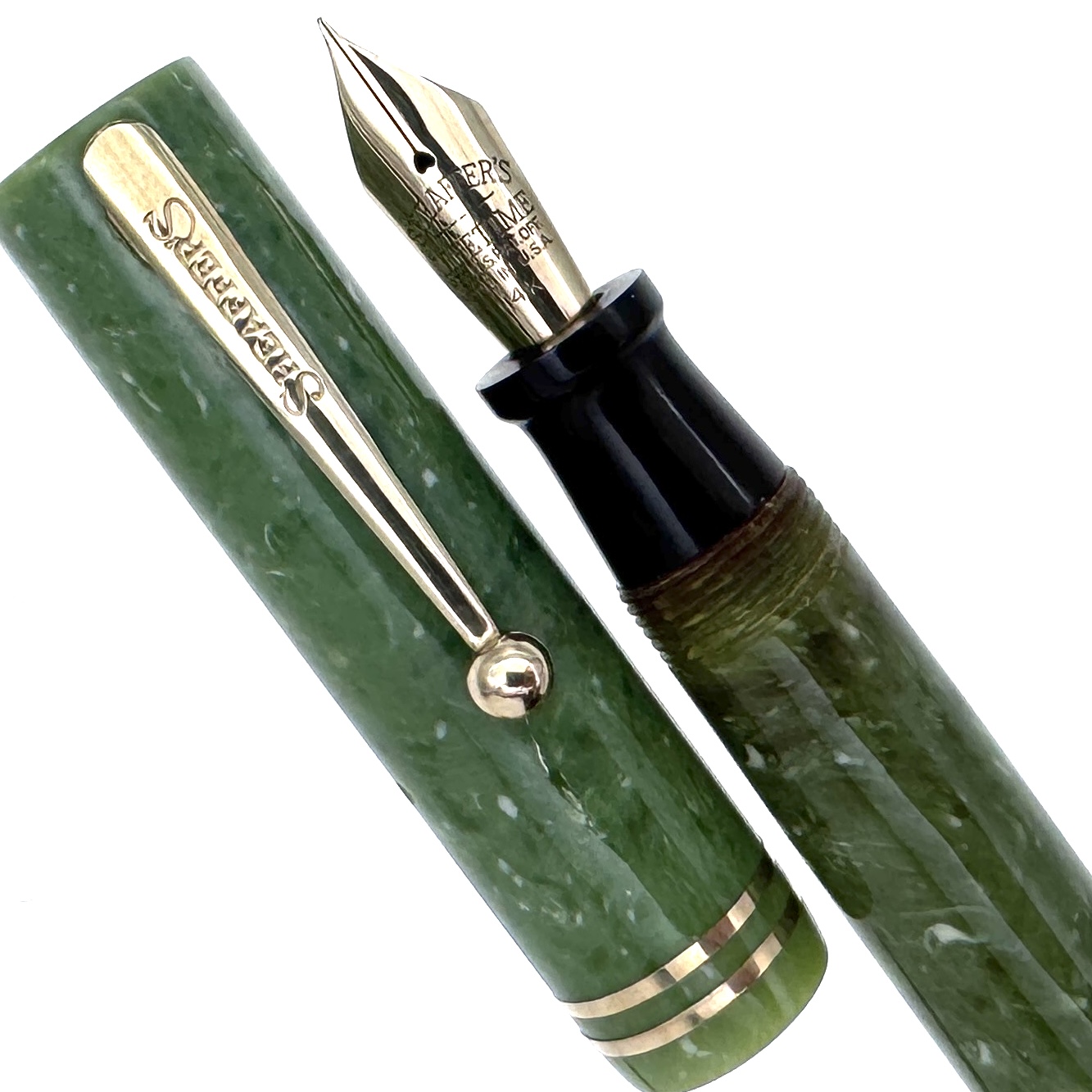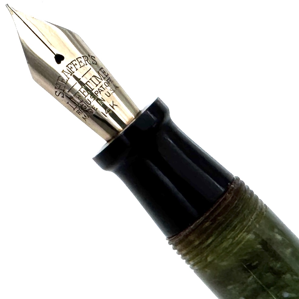 This Sheaffer’s Lifetime Jade Flat-Top pen was produced in Fort Madison, Iowa around 1928 as indicated by the straight pocket clip and just before the tapered streamline models. It sports a beautiful smooth 14K fine nib that Sheaffer’s was famous for, which writes easily in all directions while yielding a consistent line.