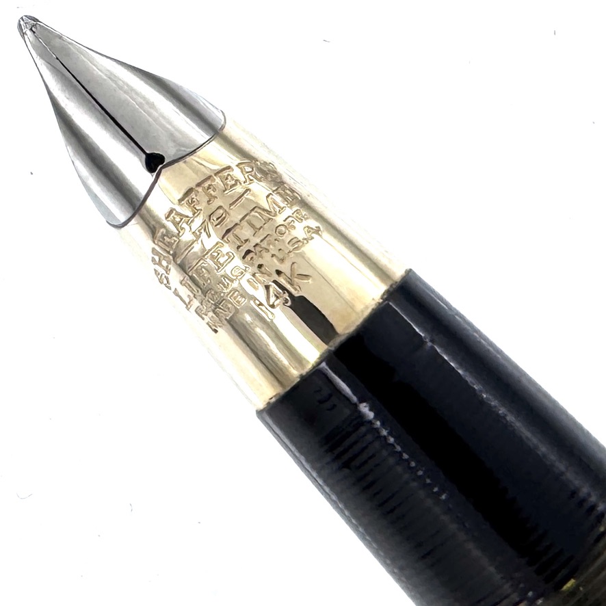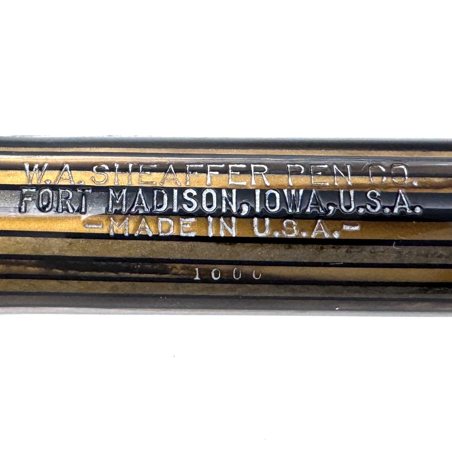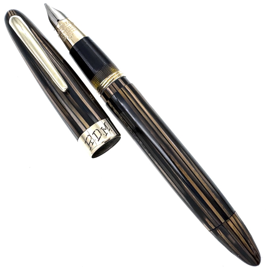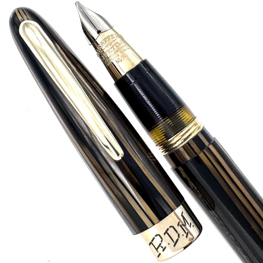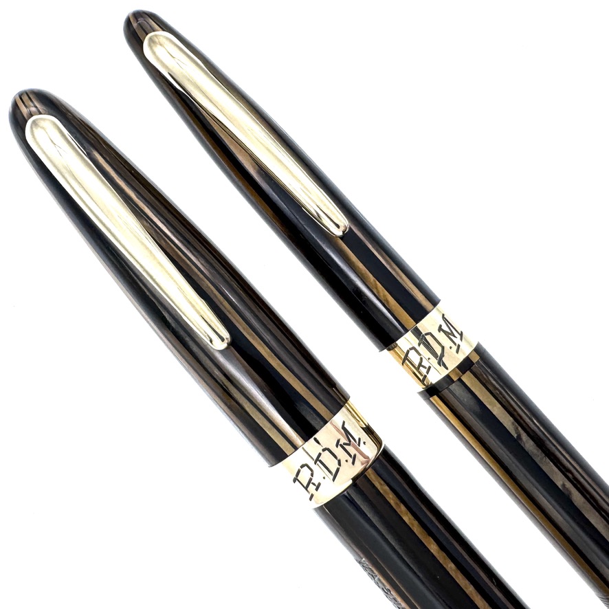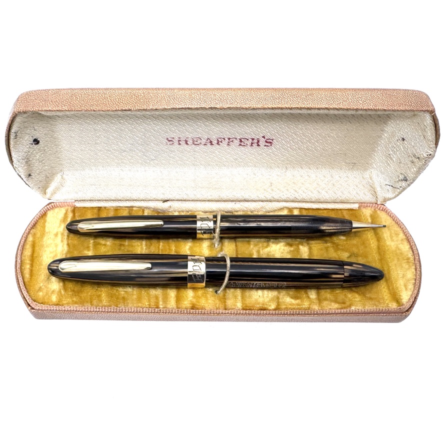 The bronze pearl stripe celluloid is bright and clear of imperfections and the vacuum filling system has been restored. The cylindrical 14K two-tone Triumph nib was state of the art in the 1940’s and still has a deserved reputation for smooth and consistent writing. Both the pen and pencil are from the top-of-the-line Lifetime offerings from Sheaffer’s pen company. The pen alone was offered at $10.00, a considerable amount at the time. This is a beautiful set from the Mottishaw collection.